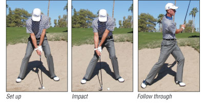 E) Swinging left through impact. To play a successful bunker shot the set up dictates what can and cannot happen.