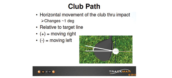 Club Path is defined in Trackman terms as the movement of the golf club the last few inches before impact and the first few inches following impact. Club path is responsible for curving the golf ball in the air.