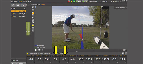 In this shot, direct your attention to the two yellow arrows on the screen. The data underneath the first yellow arrow indicates a Club Path of 0.2 degrees, indicating a golf club which is traveling almost directly down the target line. For this method to be effective, it is ideal for the player to ZERO the Club Path. The 3D Graphic Overlay of Club Path is represented by the blue line. The second yellow arrow indicates a Face Angle of -4.3 degrees closed to the target line and presented by the red arrow on the 3D Graphic Overlay.