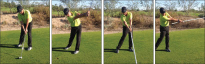 All you are going to do here is to start by making full length slow motion swings with the stick. By doing it in slow motion you will get used to the length of the stick you are using and you will also be able to feel exactly what is happening. You must make sure that you swing the stick down with your arms before your hips start to turn and trap the stick behind you. If you do this incorrectly the stick will hit the ground well behind where the ball would be. As you get better at this gradually start to pick up the speed but never much more than about two thirds full speed.