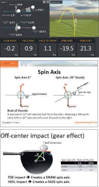 Another way the Spin Axis gets tilted is by an off center hit. How far off the toe or heel the ball is struck will either increase or decrease the axis tilt of the ball. With a driver, a ½ inch strike towards either the toe or heel will tilt the axis of the golf ball approximately 20 degrees. In our example, our Spin Axis was -19.5 degrees indicating a DRAW Axis (for a right handed player.) With that information, we know with relative certainty the ball was struck approximately ½ inch on the toe.