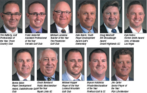 Rafferty was honored at the Southwest PGA Special Awards Ceremony on January 13, 2017 at Paradise Valley (AZ) Country Club. The evening’s program featured all 2016 Southwest PGA Award winners: Tim Rafferty of Troon Country Club – Golf Professional of the Year • Frank Underhill of Verrado Golf Club – Assistant Golf Professional of the Year • Michael Lamanna of The Phoenician Golf Club – Teacher of the Year • Dale Balvin of Golf’s Elementary – Youth Player Development Award • Doug Westcott of Desert Highlands Golf Club Bill Strausbaugh Award • Kyle Helms of University of Nevada Las Vegas – Horton Smith Award • Bernie Eaton of SaddleBrooke Golf Club – Player Development Award • Bryson Hotchkiss of Firerock Golf and Country Club – Private Merchandiser of the Year • Chuck Bombard of Royal Links Golf Club – Public Merchandiser of the Year.