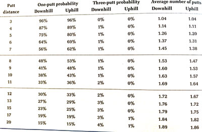 This chart I found to be one of the more telling in the book. This chart outlines (PGA Tour player) the probabilities of a one putt, three putt and the average number of putts taken until holed from various distances. A lot of the perception the general public has about putting I feel is slightly skewed due to the nature of how golf is covered on TV. More often than not, putts being made from all over the place are what dominates highlight reels.