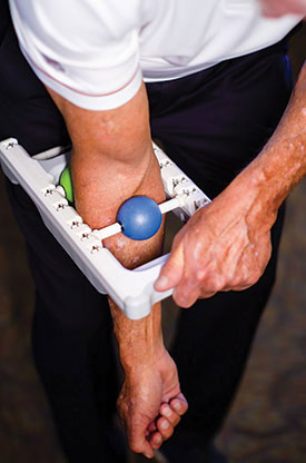 The patent-pending design is the only product that combines the features of a squeeze ball with forearm compression in one device and in a way that allows you to move fluidly from your hand to wrist to forearm to elbow and vice-versa — much like a therapist would provide.