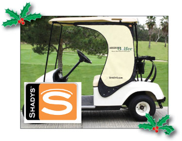 There are fun and very useful new ideas out there to put under the tree or in the stocking this year. My favorite, the new Shadys for your golf cart! You can even get a custom logo or personalize it for your golfer and it attaches to your golf bag so you can take it everywhere you play. Perfect for blocking wind in the winter and sun in the summer. Every golfer in Arizona should have one of these. Ask your pro shop about them or visit www.shadys.com.